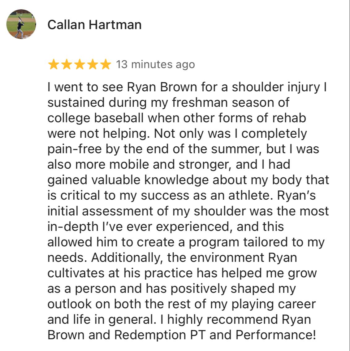Ryan has worked with players from multiple MLB organizations and consults with Division I baseball programs. He uses his passion, knowledge, and experience to help athletes of all ages return from injury and achieve their athletic goals.